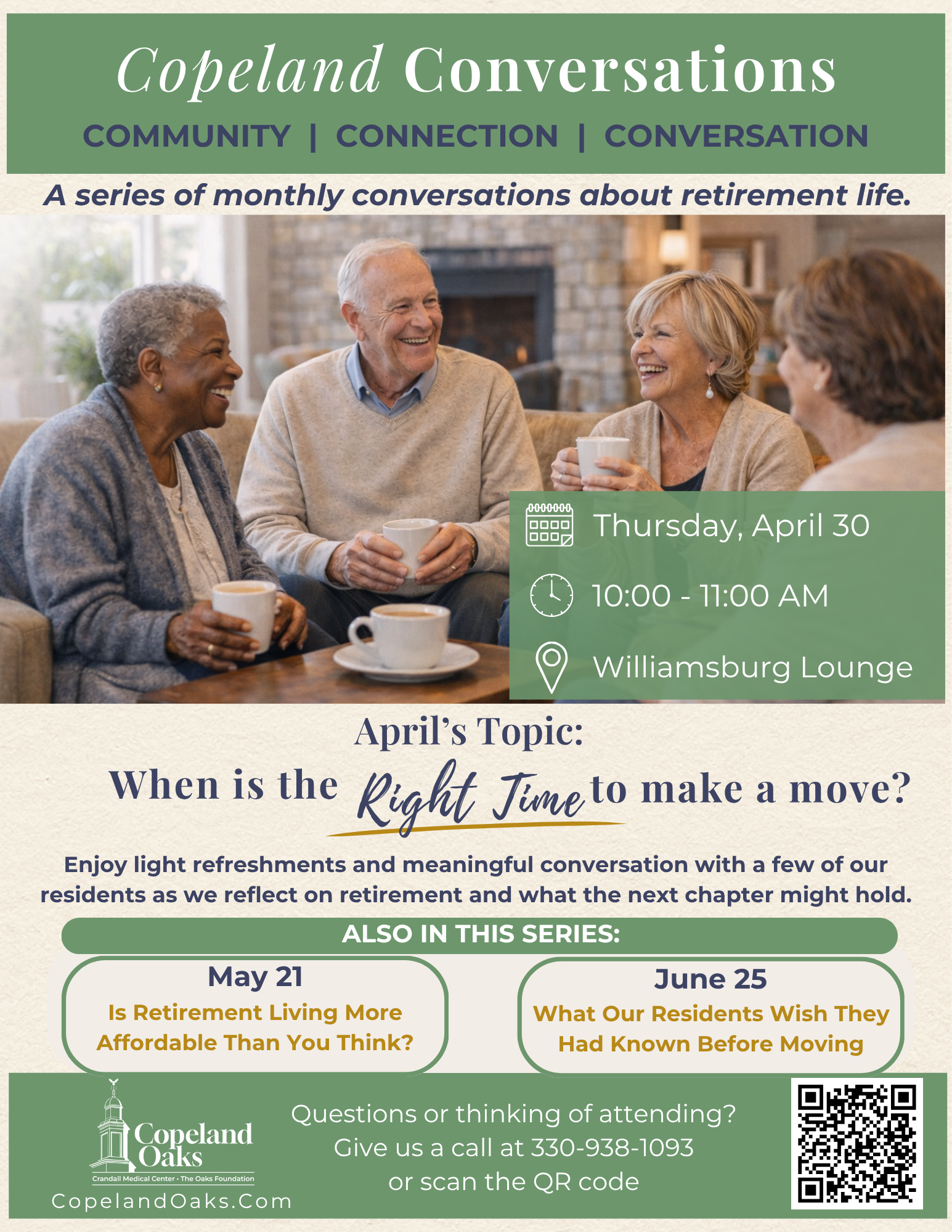 Join us Thursday, April 30 at 10 am –11 am in the Williamsburg Lounge for Copeland Conversations — a casual morning gathering with refreshments, open conversation, and the opportunity to spend time with current Copeland Oaks residents.